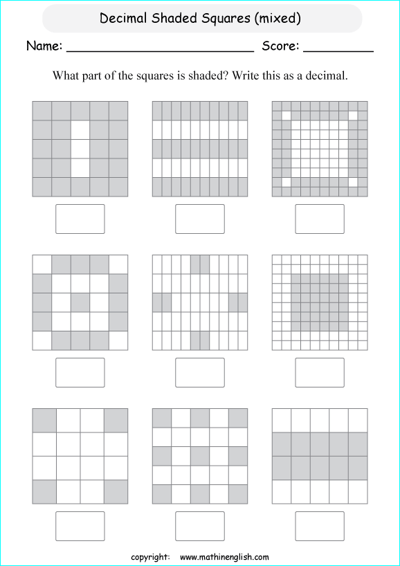 Decimal Worksheets - K12 Workbook Following sub-topics and worksheets are available for Decimal Worksheets. Click on the appropriate concept to view all the available worksheets. Decimal - Tenths Decimal Number Line - Tenths Decimal Tenths - Shade the Boxes Tenths - Sorting Game Mixed Numbers to Decimals Decimal Names - Tenths Decimal Names - Hundreds Place Value Chart